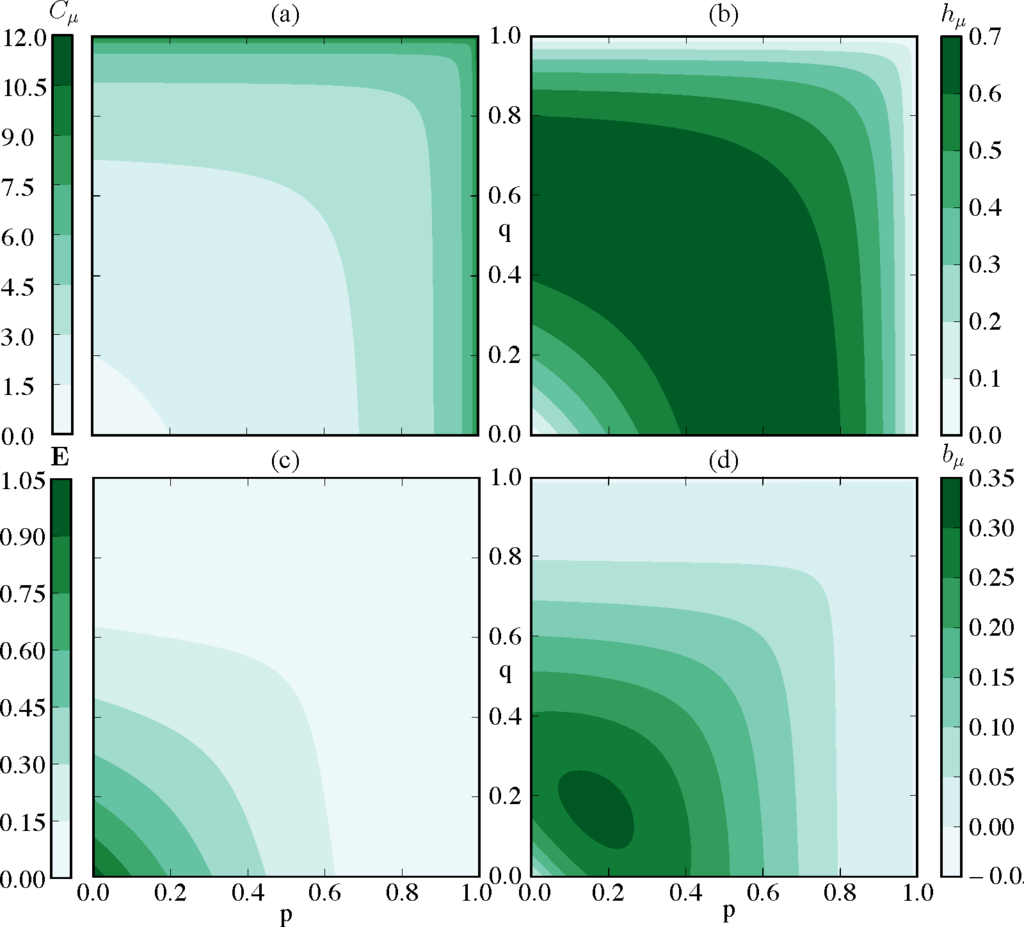 The SNS is not eventually A-Poisson with an unbounded-support interevent distribution. It can only be approximated by an eventually A-Poisson process. Therefore, one estimates its information anatomy via infinite sums. Using the formulae of Table 1, Figure 5 shows how the statistical complexity Cμ, excess entropy E, entropy rate hµ, and bound information bµ vary with the transition probabilities p and q. Cµ often reveals detailed information about a process’ underlying structure, but for the parametrized SNS and other renewal processes, the statistical complexity merely reflects the spread of the interevent distribution. Thus, it increases with increasing p and q. E, a measure of how much can be predicted rather than historical memory required for prediction, increases as p and q decrease. The intuition for this is that as p and q vanish, the process arrives at a perfectly predictable period-2 sequence. We see that the SNS constitutes a simple example of a class of processes over which information transmission between the past and future (E) and information storage (Cµ) are anticorrelated. The entropy rate hµ in Figure 5b is maximized when transitions are uniformly stochastic and the bound information bµ in Figure 5d is maximized somewhere between fully stochastic and fully deterministic regimes.