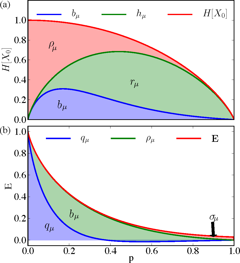 Figure 6 presents a more nuanced decomposition of the information measures as p = q vary from zero to one. Figure 6a breaks down the single-measurement entropy H[X0] into redundant information ρμ in a single measurement, predictively useless generated information rμ, and predictively useful generated entropy bμ. As p increases, the SNS moves from mostly predictable (close to Period-2) to mostly unpredictable, shown by the relative height of the (green) line denoting hμ to the (red) line denoting H[X0]. The portion bμ of hμ predictive of the future is maximized at lower p when the single-measurement entropy is close to a less noisy Period-2 process. Figure 6b decomposes the predictable information E into the predictable information hidden from the present σμ, the predictable generated entropy in the present bμ, and the co-information qμ shared between past, present, and future. Recall that the co-information qμ = E − σμ − bμ can be negative, and for a large range of values, it is. Most of the predictable information passes through the present as indicated by σμ being small for most parameters p. Hence, even though the parametrized SNS is technically an infinite-order Markov process, it can be well approximated by a finite-order Markov process without much predictable information loss, as noted previously with rate distortion theory [50].