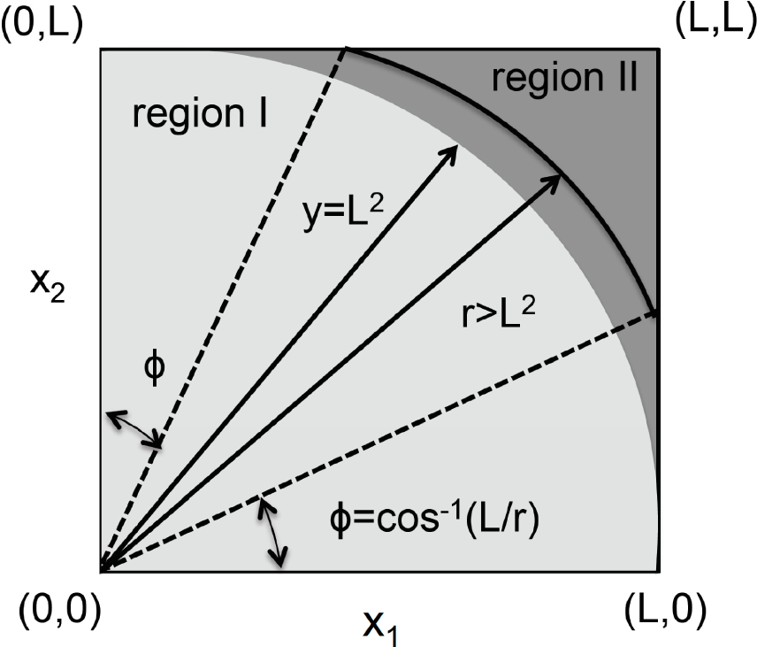 We divide the region of integration (0≤ (x1, x2) ≤ L) into two parts, region I (lighter shade) and II (darker shade) as shown in the Figure 1. Region I contains x1 and x2 values, where, x12 + x22 = y2 ≤ L2, and, region II contains the remaining of the part of the domain (0≤ (x1, x2) ≤ L) of integration. The integrals in these regions are given by the first and the second term after the second equality sign in the equation below.