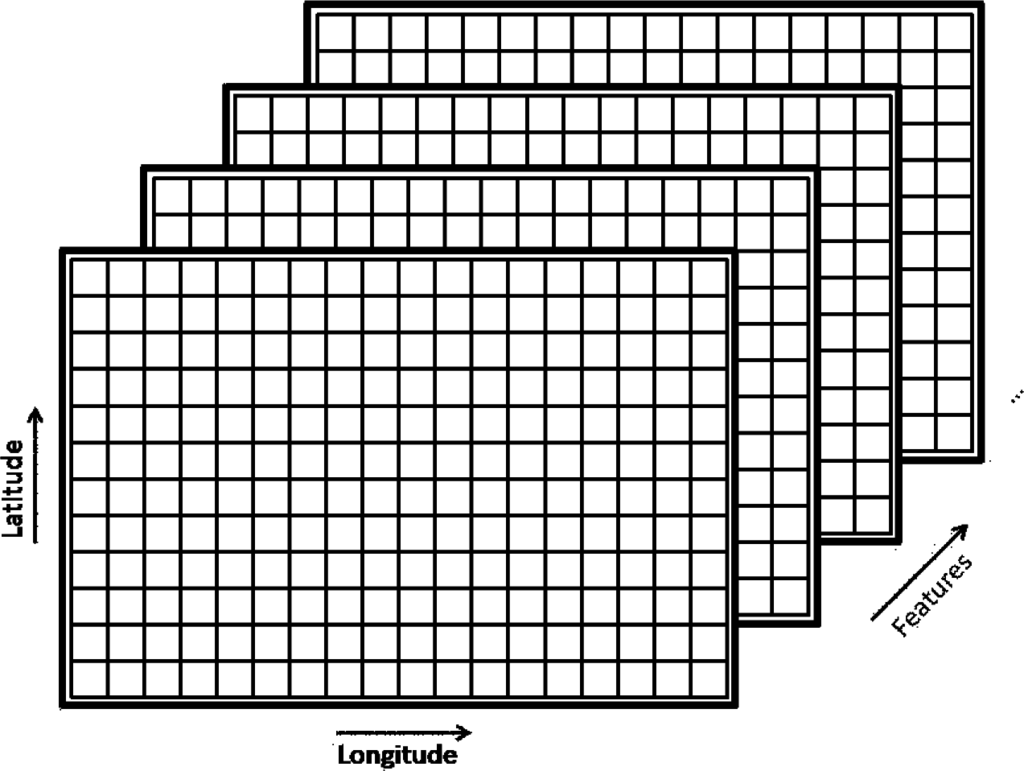 Note that TriGen was originally conceived of to deal with temporal data, that is the third dimension being time. In this context, the third dimension is composed of the seven features calculated for every latitude and longitude. In other words, these seven features could be considered seven time stamps for the tuple {longitude, latitude} introduced in [6]. Since TriGen is a general-purpose algorithm, it can be applied to any problem formulated on three dimensions. The interpretation of each dimension is up to the context of application.