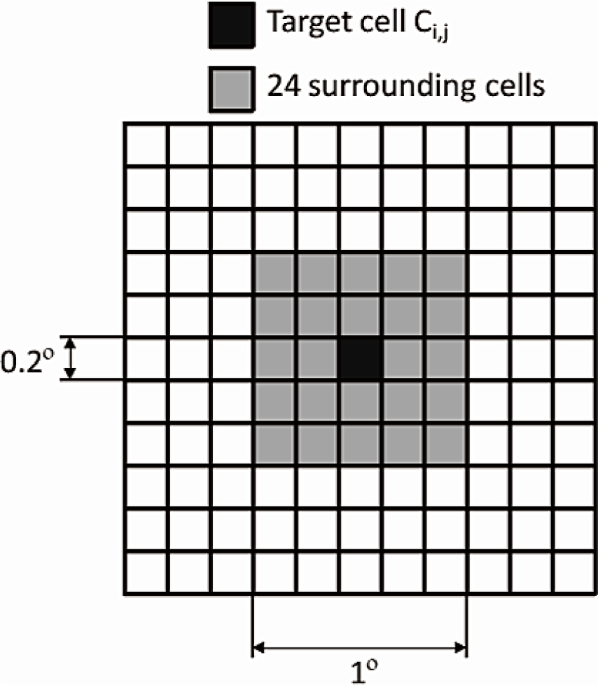 It is worth noting that all of the aforementioned features have been calculated as follows. Let Ci,j be the target cell. To calculate every feature, the 24 closest surroundings cells and Ci,j itself are considered. That is, the set of cells included in the square with boundaries Ci−2,j−2 (lower left corner) and Ci+2,j+2 (upper right corner) is used to estimate all features for cell Ci,j. The cells involved in the calculation of a target cell are illustrated in Figure 2.