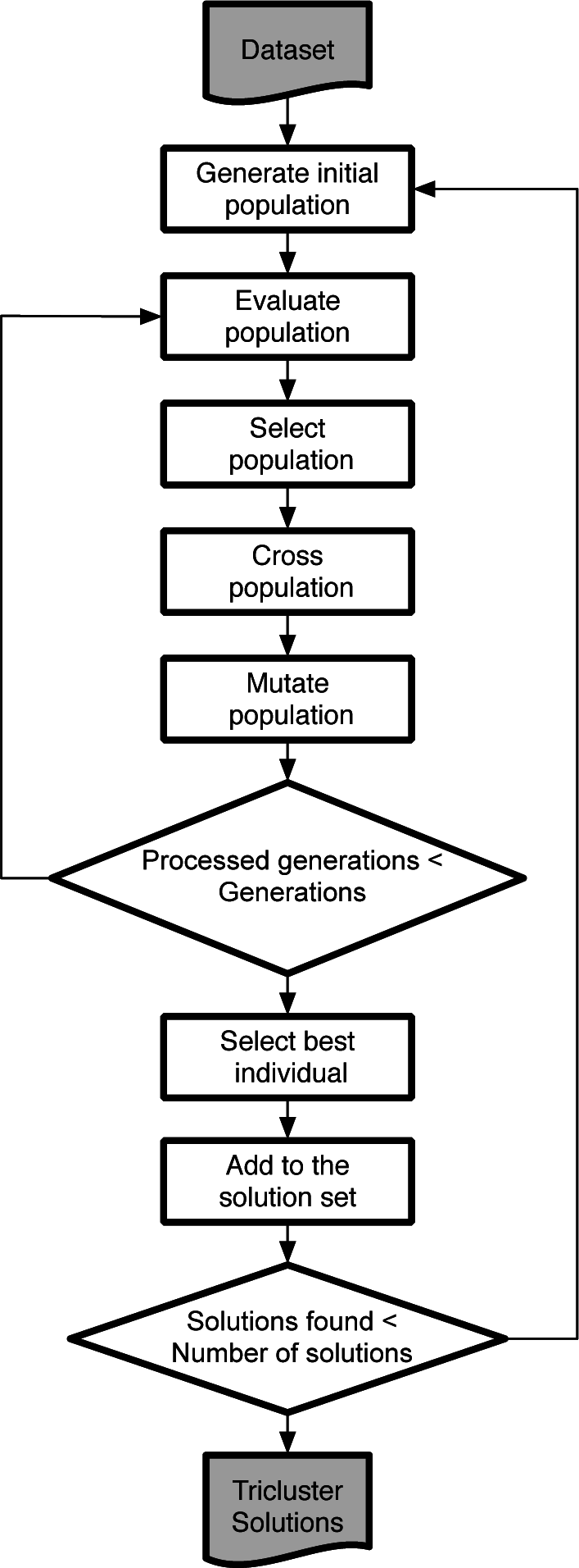 TriGen’s steps can be described as: the population initialization step in which the initial population will be created taking into account overlap with previously found solutions; an evaluation step in which each individual will be evaluated using the fitness function; a selection step, which serves to decide which individuals will survive to the next generation; crossover, which creates the necessary connections between pairs of individuals to share new genetic material; and finally, mutation, which performs punctual changes to individuals to ensure genetic variability of future generations.