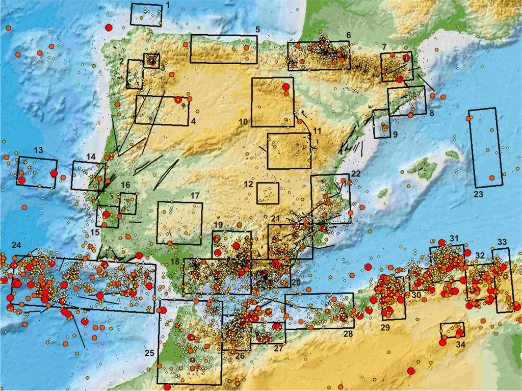 Great seismic activity is located in the east of the Gibraltar Arc. It is spread over a large area approximately 500 km wide, centered at the Alboran Sea. It contains parts of the southeast of Spain, the north of Morocco and Algeria [36]. At the west of Gibraltar, most earthquakes happen in the southern coast of Portugal, in the surroundings of the limit between the Azores and Gibraltar plates. Other seismic sources include the northwest of Spain, southern Portugal and the Pyrenees. Earthquakes are infrequent in other locations. This seismicity happens over several geo-tectonic regions with different rheology and tectonics.