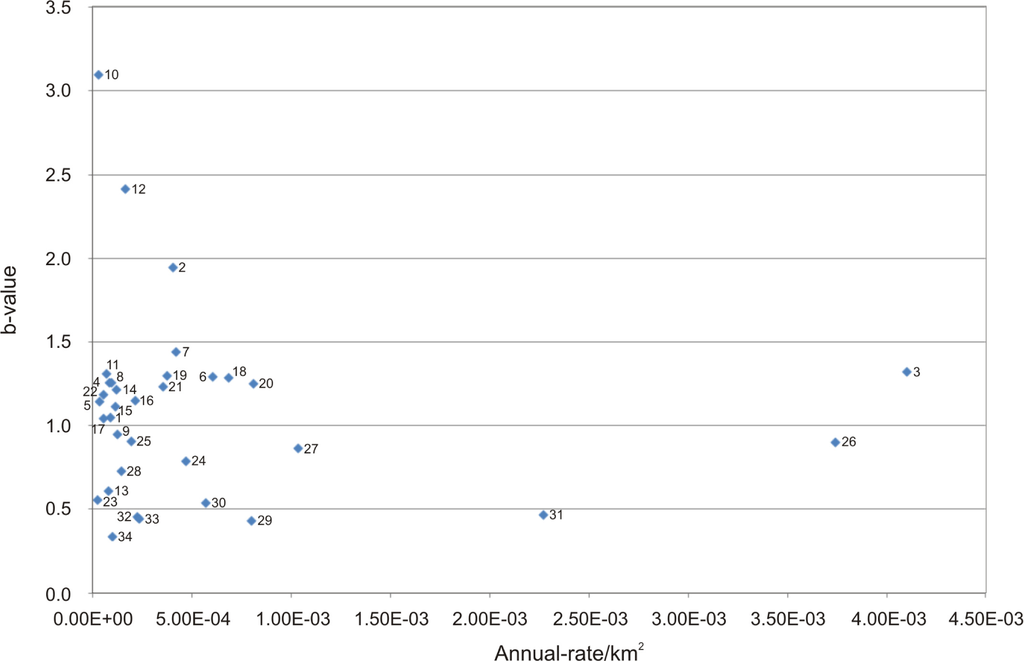 Z14 corresponds to the Mesozoic basins on the west of the Portugal fringe, and it is placed in the west of Z13. Contrarily, large earthquakes are not so frequent. Z15 and Z16 are placed on the Cenozoic basins of the lower Tagus Basin and Tagus Basin, respectively. The b-value is around one, and the annual rate of earthquakes is moderate. Nevertheless, the annual rate of Z16 is twice the rate of Z15.
