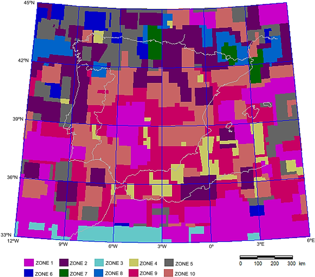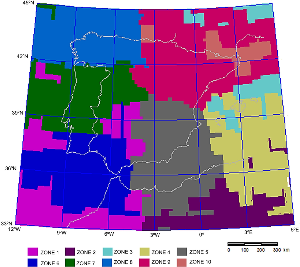 If the map shown in Figure 7 is examined in detail, some vague correlations with geology can be made. Zones 1 and 6 in the south of the IP correspond to the Azores-Gibraltar fault and the north of the Africans plate. Zones 1 and 7 in the center of the IP show the low seismic activity zones of the Central Massif and the Mesozoic basins. It can be observed that Zone 5 coincides with the Alboran Sea, the southeast of the IP and the south of the Balearic Islands. The Pyrenees present a very complex structure represented by labels 2, 9 and 10, similarly to the zoning in [43]. The Azores-Gibraltar fault, Z24 in this study, has been characterized by labels 1, 5 and 8. Seismicity in Portugal was mainly labeled 7 and 8.