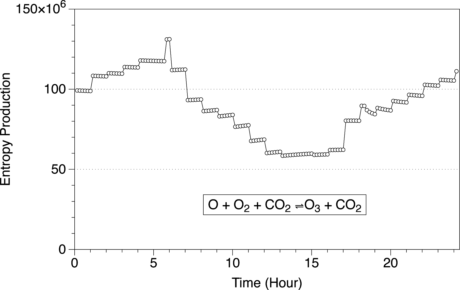 2 reaction at the surface level in the Martian atmosphere. The results are shown for Ls 180 as an example of the evolution of the chemical entropy within a day. The sign of the reaction is positive, meaning that the entropy is increasing as a consequence of this chemical reaction, and it changes during the day. The profile is regulated by the changes in thermodynamic variables and the composition of the atmospheric species. As can be seen, the system usually reaches equilibrium almost instantaneously for a given value of temperature and pressure, and the variation in entropy production is almost constant for a given temperature. However, some points at certain hours show a different behavior, as for example those points at Hour 6 and Hour 18. The non-constant behavior in the entropy production at those hours is a consequence of the changes in the concentration of the compounds and changes in the thermodynamic variables at the crater Gale. The chemistry is “disturbed” by the changes in temperature and pressure, and it takes a while until it goes back to normality. In