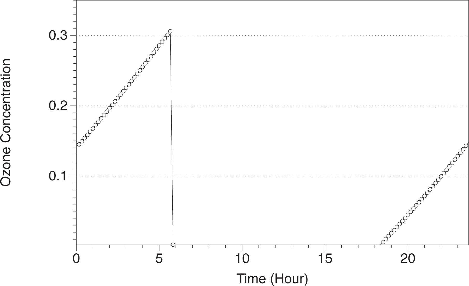 Figure 2, we show the concentration of ozone in the Martian atmosphere at the surface level at Ls 180. When the sun rises around Hour 6, the ozone concentration decreases drastically in two orders of magnitude as a consequence of photochemical reactions, creating a perturbation in the entropy production. At Hour 18, with sunset, the ozone concentration starts to increase, creating also a perturbation in the entropy production.