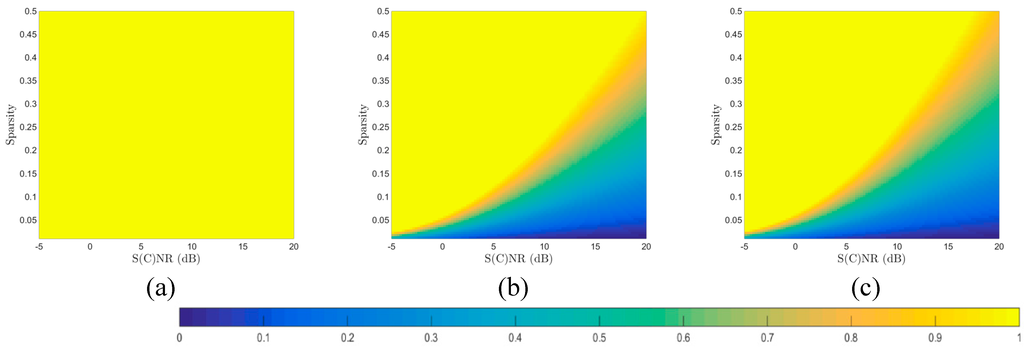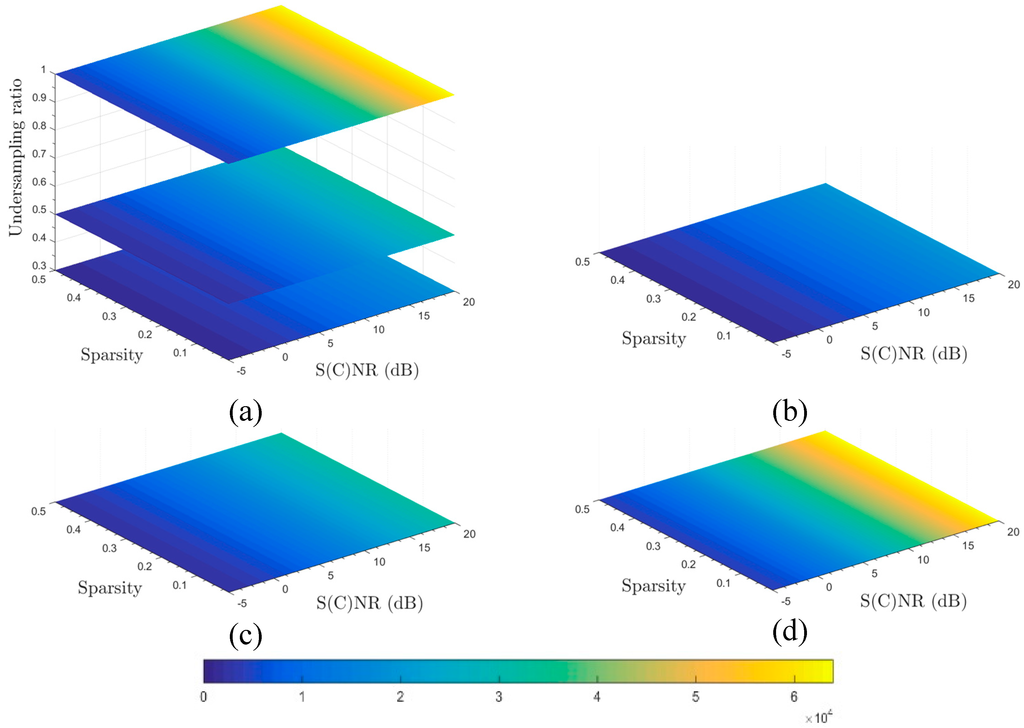 Figure 5a–c shows the images indicating minimal (i.e., necessary) undersampling ratios in relation to scene sparsity and per-sample S(C)NR, given MSE distortion levels D of 0.01, 4, and 10, respectively. As previously, distortion levels D are relative to σ 0 2 . Clearly, with more relaxed or greater distortion thresholds, the undersampling ratios required will be reduced, given the same values of scene sparsity and per-sample S(C)NR.