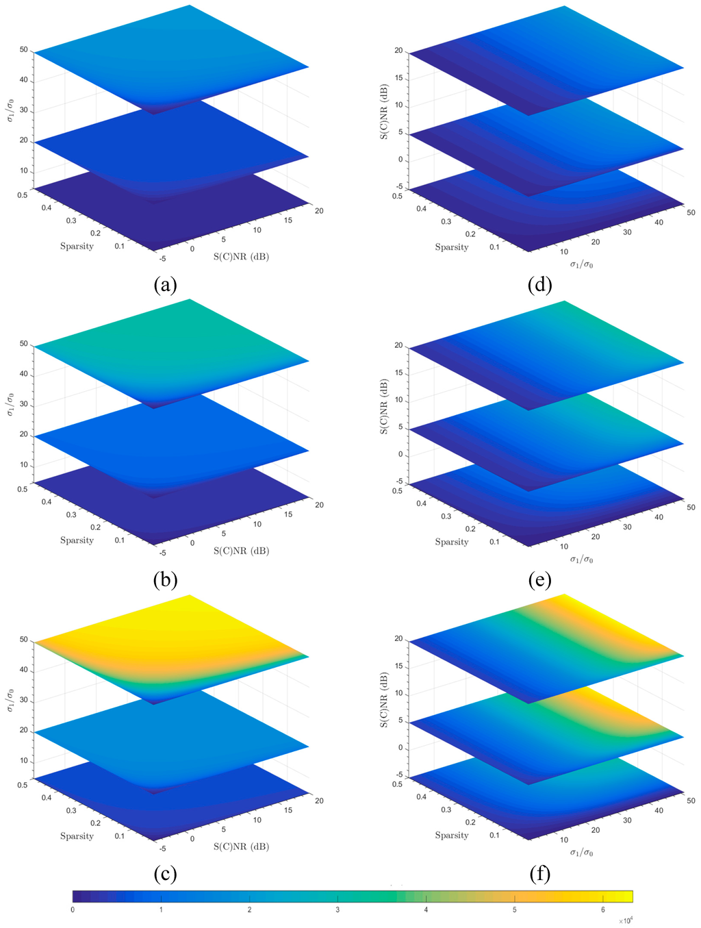 Figure 4. Slice images representing varying mutual information conveyed by echo data about the targets of interest under different undersampling ratios, sparsity, TBR (actually σ 1 / σ 0 ), and S(C)NR: (ac) undersampling ratios = 30% , 50% and 100%, respectively, and all with TBRs (in vertical axes) of 25, 400 and 2500 (i.e., 5, 20 and 50 in terms of ratios of square root TBRs as shown in the Figures) from bottom up; (df) 30% , 50% and 100% undersampling ratios, respectively, and all with S(C)NR (in vertical axes) of −5, 5 and 20 dB.