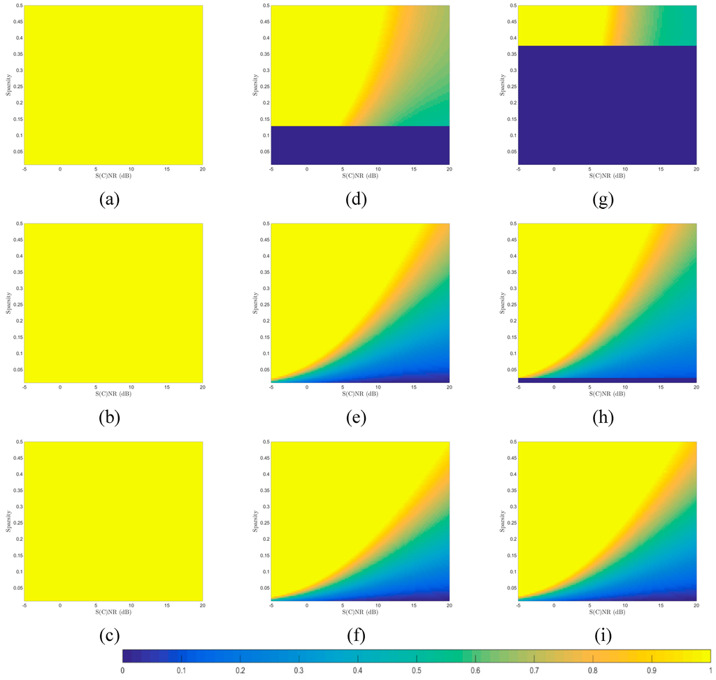 To assist interpretation of the results, these diagrams are organized in row and column groups. The row grouping is based on TBRs (actually σ 1 / σ 0 ): 5 (Figure 6a,d,g), 20 (Figure 6b,e,h), and 50 (Figure 6c,f,i). The column grouping is based on MSE distortion levels: 4 (Figure 6a–c), 100 (Figure 6d–f), and 400 (Figure 6g–i), where all MSE distortion levels are relative to σ 0 2 . Similar to the phase diagrams in Figure 5, greater distortion thresholds lead to smaller necessary undersampling ratios, given the same values of scene sparsities, TBRs and per-sample S(C)NRs. With increasing TBRs, necessary under-sampling ratios will be decreased, while all other settings are kept the same. An important link can be made of the similarity between phase diagrams shown in Figure 5a–c and those in Figure 6c,f,i, as the former represent the limiting cases of those in Figure 6, when TBRs become sufficiently large (e.g., σ 1 / σ 0 = 50).