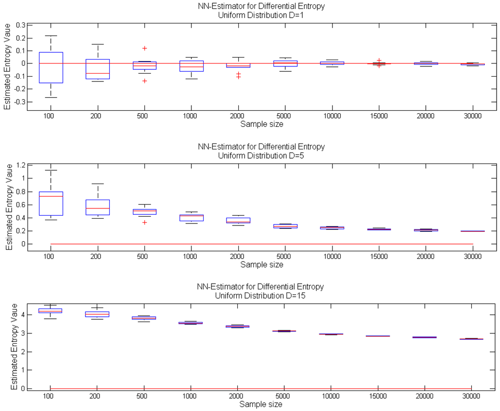 Performance of the k-nn estimator Equation (1) for increasing sample size: box-plots of estimated entropy values for samples from a uniform distribution: on interval [0,1] (top); on hypercube (center); on hypercube (bottom); with real entropy value denoted by the red line.