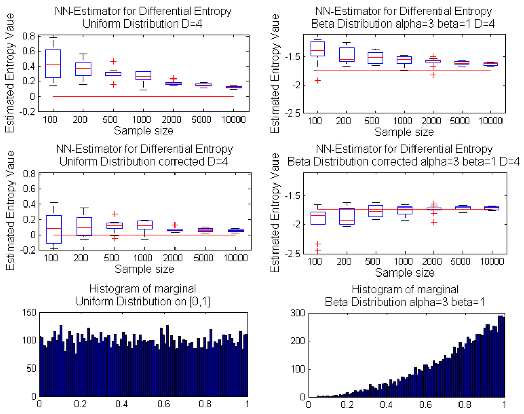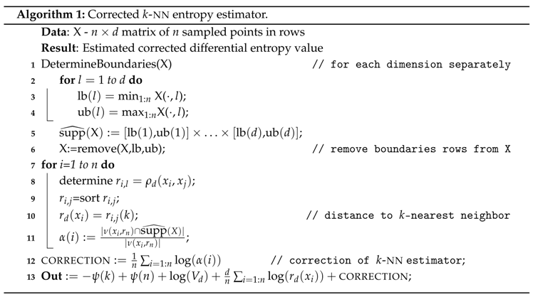 Algorithm 1 presents the pseudocode of the corrected k-nn entropy estimator. The bias correction presented on the uniform example can be applied for any multivariate distribution. However, due to the source of bias, our correction is much more efficient for random variables with bounded support. Therefore, in the next section, we focus on the usefulness of Algorithm 1 for multidimensional uniform and beta distributions with both independent and dependent marginals. The exemplary dependency structure is modeled by a Gaussian copula.