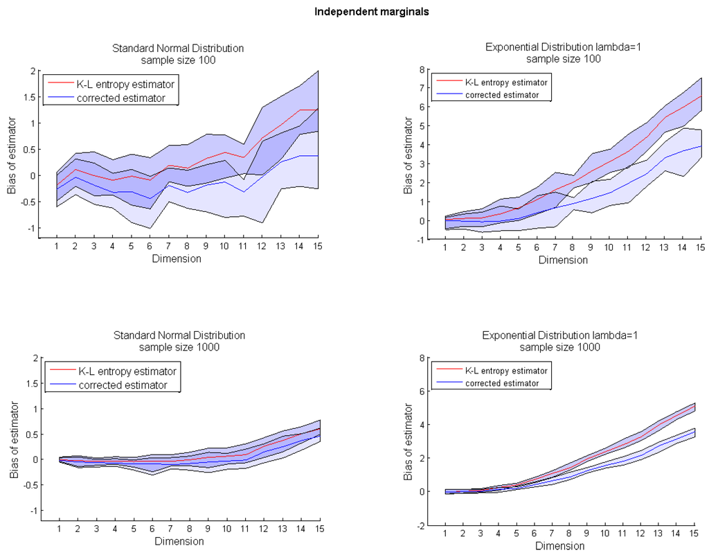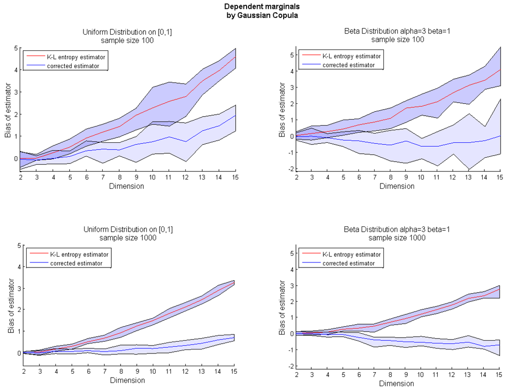 The dependent marginals case is much more realistic in many applications, e.g., for sensitivity analysis in systems biology. We decided that the dependency structure between marginal distributions by means of an appropriate copula is flexible enough to model various dependencies between model parameters. Moreover, the controlled dependence structure allows one to calculate the real estimated entropy value and to estimate the bias of an estimator [23]. It occurred that in the case of dependent variables, the accuracy gained by the corrected estimator is as significant as in the case of independent marginals. Improvement of the k-nn estimator was tested for samples from multivariate distributions with marginals supported on a bounded interval, i.e., uniformly distributed on interval [0,1] and non-uniformly distributed on interval [0,1] (beta marginals); cf. Figure 5 and Figure 6.