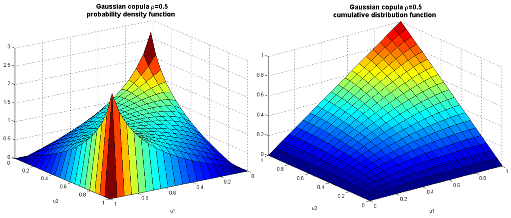 Gaussian copula probability density function for two marginal variables with correlation coefficient (left); and a two-dimensional copula function with correlation coefficient (right).