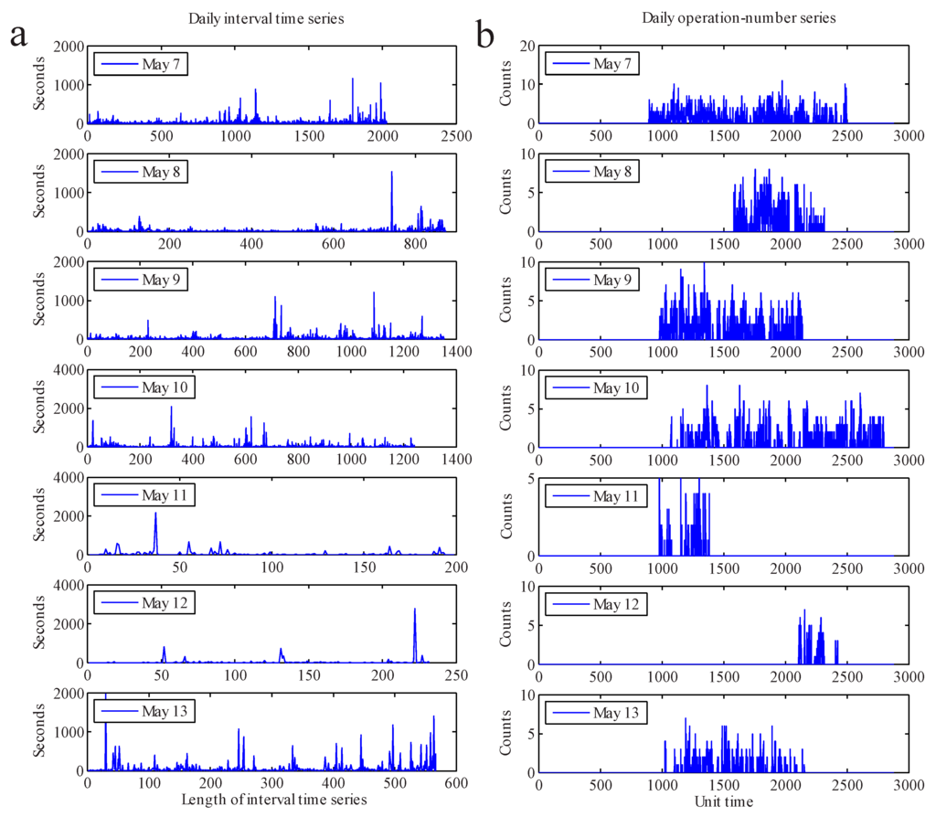 (a) Daily interval time series of operating behavior from an individual chosen randomly from the worker group during a week; (b) Daily operation-number series from the same individual during the same week.