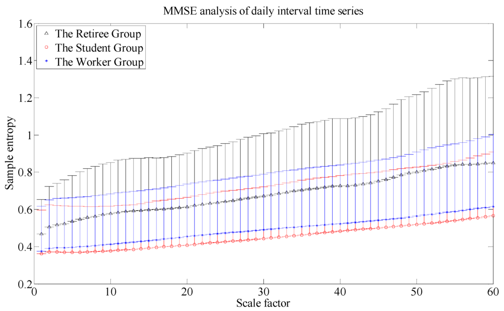 Here we should mention that although the MMSE algorithm is less affected by the sequence length than the MSE algorithm, it still provides an inaccurate estimation when the length of time series is less than 500. Thus, to overcome this issue, we only analyze the daily interval time series with lengths larger than 500. Also, only the operation-number series corresponding to those long interval time series are taken into account. We first calculate the MMSE values of the daily interval time series and the operation-number series of each individual during the four-week sample period and then combine the MMSE values of each individual belonging to the same group. The MMSE analysis of the daily interval time series and the operation-number series are plotted in Figure 2 and Figure 3, respectively. The error bar and symbol at each scale represent the SD and the mean value of the MMSE values calculated from all individuals in each group.