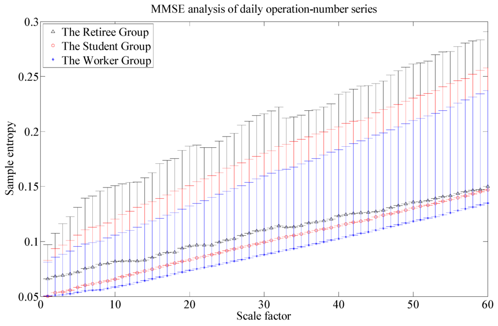 The behavior frequencies of the workers and the students during the active periods are generally higher than the inverse of the sampling interval (2 s) partially due to their proficiency in operating computers. Such high-frequency patterns are smoothed by the sampling process. Therefore, the sampled time series exhibits more regularity than the original ones, leading to the comparative low values of the MMSE analysis. In contrast, the slow rhythm of the operating behavior for the retirees may arise from their unfamiliarity with computer operation and physiological reasons, which enlarge the interval time and enrich the structure of the operation-number series such that the MMSE values of both kinds of time series for the retiree group maintain on a relatively high level. With the increase of the time scale, the coarse-grained procedure aggregates the operations in larger intervals such that the distinctions of the structure in daily operation-number series between the retiree group and the other two groups caused by the different behaivor rynthm are gradually mitigated. This might be the reason why the differences between the MMSEs of the daily operation-number series from the retiree group and the other two groups are significant only on small time scales.