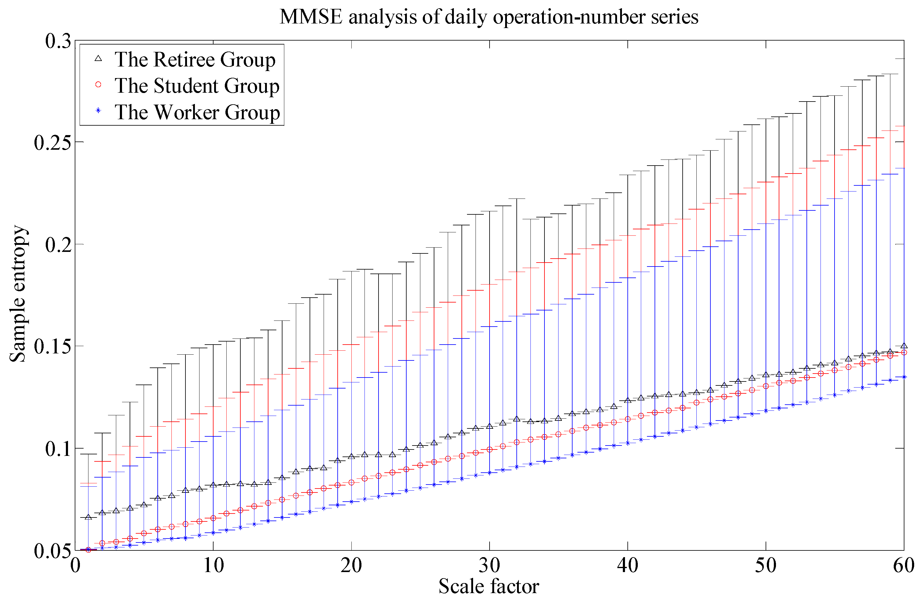We note that the MMSE values of the daily interval time series are obviously higher than that of the daily operation-number series. This is due to the long period of zero values in the beginning and the end of the daily operation-number series. Also, the mean values of all three groups’ MMSE values in Figure 2 and Figure 3 gradually increase with the growth of the time scale. We think this is caused by the coarse-grained procedure, which progressively eliminates a lot of zero-values in the daily operation-number series and the same values in the daily interval time series such that the MMSE values increase versus the time scale. For all time scales the MMSE values of the daily interval time series from the retiree group are significantly higher than that from the student group (p < 0.05, Mann-Whitney-Wilcoxon test (MWW test)) and the worker group (p < 0.05, MWW test) as shown in Figure 2. However, the MMSE values of the daily operation-number series of the retiree group are significantly higher than that of the student group (p < 0.05, MWW test) only for time scale less than 4 and the worker group (p < 0.05, MWW test) for time scale less than 12, as implied in Figure 3. These findings imply that the operating behavior of the retirees is the most complex compared with the other two groups on small time scales.