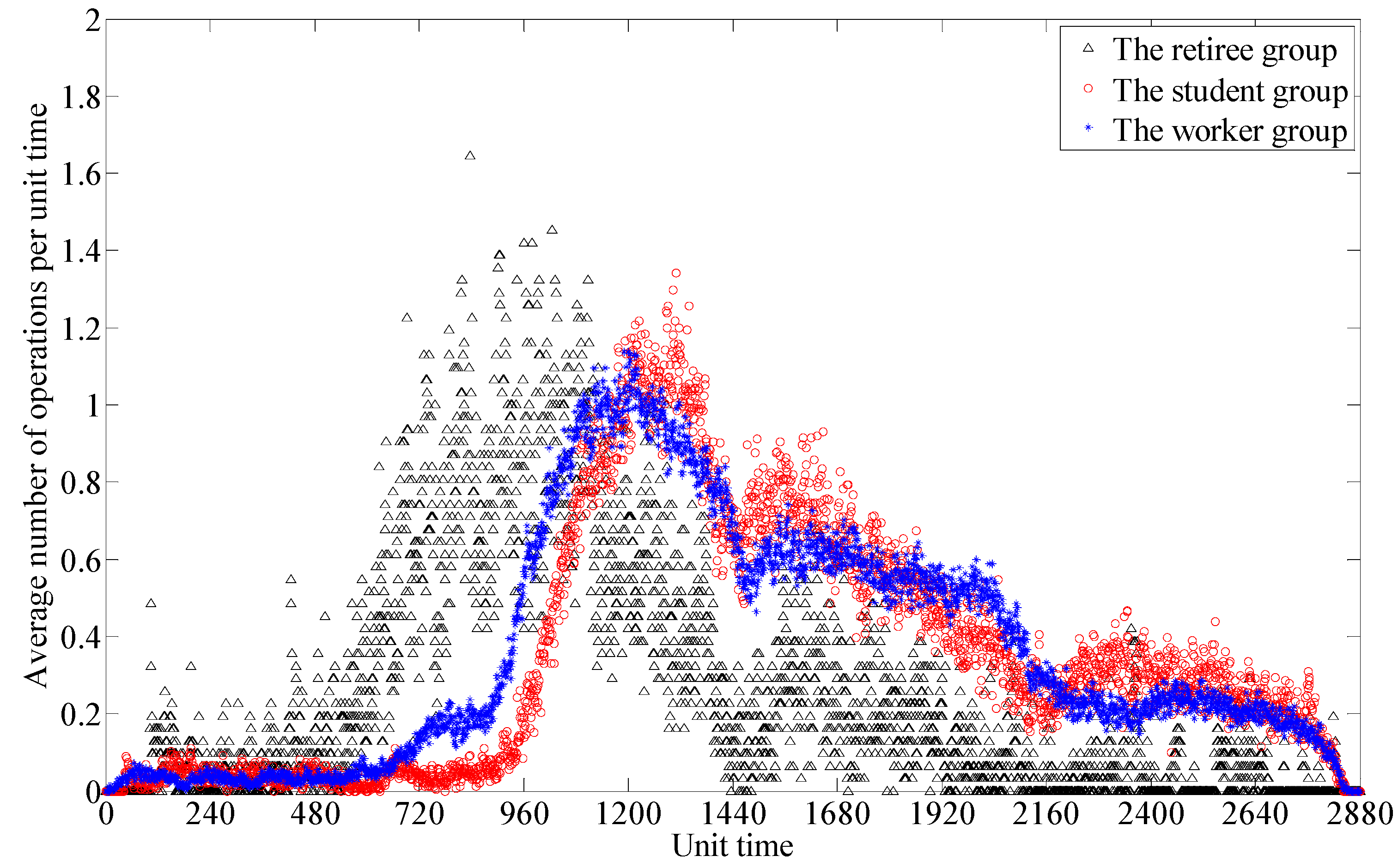 The circadian rhythms of each group are also reflected by those curves. Older people are accustomed to early hours such that their operations occur earlier around 720 (6:00 AM), while the workers start their operations near 960 (8:00 AM), coinciding with office hours. In addition, a local minimal also appears in both curves around 1440 (12:00 AM), which corresponds exactly to lunchtime.