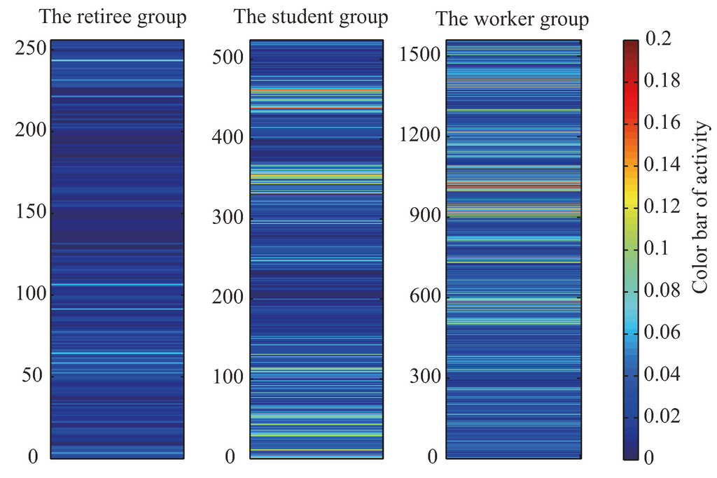 where n is the total number of the operations of an individual, correspond to the occurrence times of the operatings and is the whole interval time in which the total operations have performed. Figure 5 shows the activities of individuals from the three groups during the four weeks. Each row is associated with an individual in a single day. The activity is represented by the color scale. The color map of the activities for the retiree group appears to be more dusky than the other two groups, which suggests that the retirees are less active than the others. Actually, the activies of the retiree group (0.016 0.013 (mean SD)) are significantly less than those of the student group (0.034 0.027 (mean SD), p < 0.05, MWW test) and the worker group (0.042 ± 0.032 (mean SD), p < 0.05, MWW test). In addition, the worker group is significantly more active than the student group (p < 0.05, MWW test). Since the activity reflects the number of operating behaviors per unit time, the above findings indicate that the retirees operate the computer more slowly than the individuals from the others two groups.