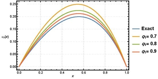 The exact solution of (29) in the case corresponds to q1 = 2 and q2 = 1 is u(x) = x(1 − ex–1). In Table 2, we compare our results with those obtained in [32,39]. Figure 1 illustrates that the approximate solutions in the case corresponds to q2 = 2 and for various values of q1 near the value 1, have similar behavior.