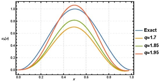 The exact solution of Equation (30) for the case q = 2 is u(x) = sin2(πx) We apply CFMM. Table 3 lists the maximum pointwise error of Equation (30) for the case q = 2 and different values of n. Figure 2 illustrates that the behavior of the approximate solution for values of q near 2 is somehow close to the behavior of the exact solution.