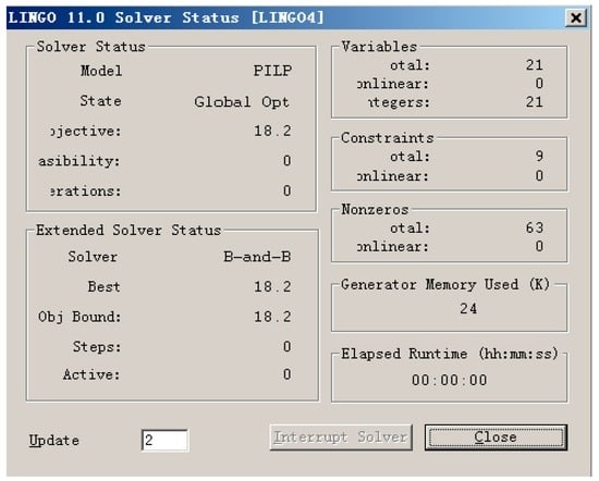 The software of LINGO11.0 is applied to construct and solve the model on the dual-core computer (processor: 3.0 GHz, memory: 2 G). The solver status window is as shown in