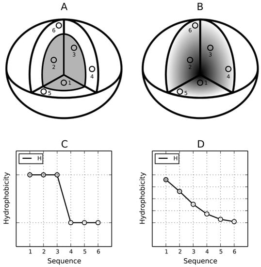 Comparison between the classical discrete oil drop model (A,C) and the fuzzy oil drop model (B,D). Circles represent positions of hydrophobic (dark) and hydrophilic (white) residues. The charts represent the assumed distribution of hydrophobicity density in each model. The figure intentionally resembles the one presented in [] so as to visualize the continuity and evolution of theoretical hydrophobic core models.
