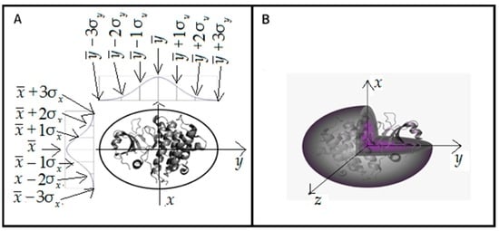 Graphical representation of the encapsulation of the protein molecule with a 3D Gaussian. (A) two-dimensional Gaussian forms plotted along the horizontal (X-axis) and vertical (Y-axis) axes. The volume of the capsule (drop) is determined by its σ coefficients. Since σx > σy, the molecule is stretched along the X axis. The boundary of the 3D capsule is given by the so-called three-sigma rule for each axis independently (); (B) protein molecule encapsulated in an ellipsoid. Changes in coloring (from gray to purple) represent increasing hydrophobicity density.