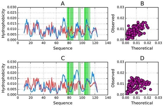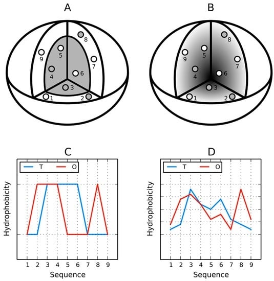 The residues in the protein body may be located in accordance with their own hydrophobicity (hydrophobic ones near the center and hydrophilic ones on the surface). However, it may also happen that this rule is not followed (Figure 3). The discrete model can be used to qualitatively characterize each residue as either “properly” or “improperly” located in the protein body (Figure 3A,C). In contrast, the continuous (fuzzy oil drop) model expresses this phenomenon in quantitative terms (Figure 3B,D). If we assign two parameters to each residue—its theoretical (T) and observed (O) hydrophobicity density—and then present both values for all residues in the protein chain in the form of a profile, the resulting charts can be superimposed to discover areas of disagreement between both distributions.