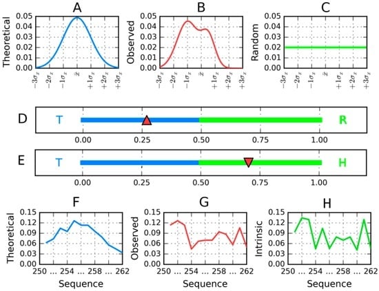 For the purposes of this publication we have defined another reference distribution, denoted H (Figure 4). This distribution expresses solely the intrinsic hydrophobicity of each amino acid residue (according to a preselected scale) []. In our work it replaces the uniform reference distribution (R) and is therefore regarded as the polar opposite of the theoretical distribution (T). H is only applied in the analysis of individual secondary folds. In order to avoid ambiguities, we introduce the following two parameters: RD(R) and RD(H), which express the status of the observed distribution with respect to two boundary cases: ranges defined by T and R, and by T and H respectively. The value of RD(R) is equivalent to the RD parameter, expressing the “distance” between the observed distribution and both “standard” reference distributions (T and R). Accordingly, it informs us whether the protein in question contains a well ordered hydrophobic core. In contrast, RD(H) reveals the degree to which the placement of individual residues in a given sequence matches their intrinsic hydrophobicity.