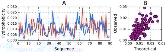 The titin domain is an example of a structure which contains a prominent hydrophobic core (RD = 0.382). This low value indicates that the observed distribution (Table 2) closely corresponds to theoretical values and that therefore the protein contains a concentration of hydrophobicity density at its center, encapsulated in a hydrophilic shield (which, according to the fuzzy oil drop model, forms an integral part of what we refer to as the “hydrophobic core”). Figure 5A illustrates good agreement between T and O in titin. Local deviations from the model (excess hydrophobicity at positions 15, 16, 43–44, 65–66 and 63, along with a hydrophobicity deficiency at positions 33–35) do not spoil the big picture—the molecule as a whole is regarded as stable. This observation is also in agreement with the correlation coefficient (observed versus expected) computed for the whole domain (correlation coefficient = 0.661—Figure 5B).