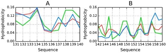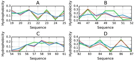 The β-strands at 54–61 (Figure 6C) and 46–52 (Figure 6B) are in particularly good agreement with theoretical values, possessing hydrophobic fragments in their central sections and hydrophilic fragments on the outside.
