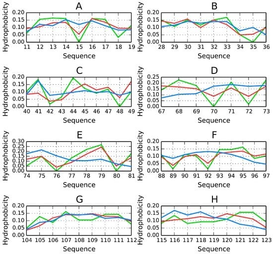 T, O and H hydrophobicity density distribution profiles for individual β-strands in transthyretin. Numbers indicate which residues form part of the selected fragment. Distribution: T—blue, O—red, H—green. (A) β-fragment 11–19; (B) β-fragment 28–36; (C) β-fragment 40–49; (D) β-fragment 67–73; (E) β-fragment 74–81; (F) β-fragment 88–97; (G) β-fragment 104–112; (H) β-fragment 115–123.