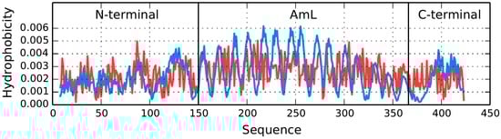 The manner in which we performed sequential comparisons of the presented proteins differs from standard practice. The usual algorithm is to process both chains one residue at a time and calculate the number of positions where residues either match or are closely related (e.g., Ile and Leu). In our study, however, the object of analysis is not a sequence of characters (amino acid codes) but rather the distribution of hydrophobicity along the input chain. The intrinsic hydrophobicity scale proposed in [] is taken as the basis for computing correlation coefficients. Correlation is calculated for the intrinsic hydrophobicity (as embodied by a particular fragment) and for the observed (O) as well as theoretical (T) distributions. The correlation coefficients serve as a measure of similarity of each pair of fragments. Individual β folds of AmLare taken as templates. Each of them is treated as a window, which then overlaps fragments of the compared protein. The window is shifted along the chain with a step of 1 amino acid. For each overlap, the corresponding correlation coefficient is calculated. A high value is seen as indication that the given fragment (in the protein undergoing analysis) closely corresponds to the template and is therefore a potential seed for amyloid formation.