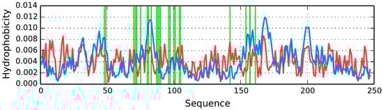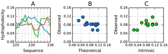 Actual distribution of hydrophobicity density in a protein molecule may differ from theoretical expectations since it is influenced by the properties of each residue—its placement in the protein body (including neighboring residues) and its intrinsic hydrophobicity (compare Figure 1 and Figure 3).