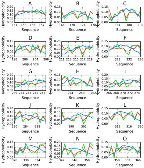 Particular attention should be devoted to fragments at 23–25, 28–36 and 104–112 (Figure 9B,G), listed in Table 3. All of them conform to the model with high accuracy. Much like in titin, good agreement is observed for both sets of reference distributions (T vs. O and T vs. H). Fragments at 11–19, 67–73, 74–81 and 88–97 (Figure 9A,D–F) diverge from the model, with high RD values calculated for the T distribution (meaning significant deviations from the concentric hydrophobicity density field), as well as for the H distribution (indicating that the placement of individual residues is not aligned with the structure of the shared core but instead corresponds to their intrinsic hydrophobicity, and can therefore be called “selfish”). This phenomenon is readily apparent in Figure 9A,C–F.