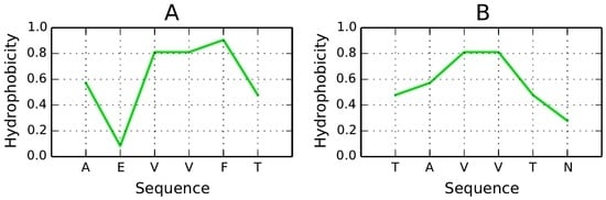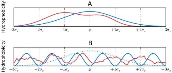 If we assume that the “natural” external force field produces an ordered hydrophobic core, an interesting question emerges—can variations in this field produce alternative distributions of hydrophobicity density? We have identified several protein families in which the actual (observed) hydrophobicity density distribution very closely matches theoretical values. This includes the antifreeze [] and downhill [] proteins. Local discordances between the idealized and observed distributions frequently correspond to active sites: local hydrophobicity deficiencies usually suggest the presence of a ligand binding cavity [,] while local excess hydrophobicity—if present on the surface of the protein—may indicate a complexation site [,].