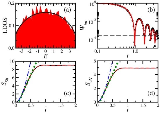 We consider the initial state (10) evolving under a GOE full random matrix. Top panels: local density of states (LDOS) (a) and the survival probability (b). The symbols in (b) refer to Equation (14), and the dashed horizontal line is from Equation (26). Bottom panels: evolution of the Shannon entropy (c) and von Neumann entanglement entropy (d). Dashed lines correspond to the expression in Equation (19) with in (c) and in (d). The dashed lines are indistinguishable from the numerical results (solid lines). Dot-dashed lines are Equation (20). Circles represent linear fits, , with and . The random numbers of the full random matrix are rescaled so that ; . We choose and as in Figure 1.