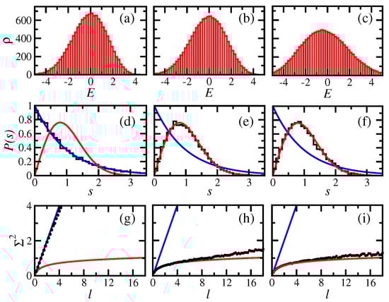 The initial impression is that there is not much difference between Figure 3e,f and Figure 1a. However, visibly, the spectrum of the GOE full random matrix is more rigid than those for the chaotic spin models, as evident by comparing Figure 1b with Figure 3h,i. This reinforces the importance of considering different signatures of quantum chaos when comparing models.