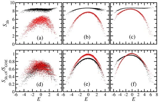 In Figure 4d–f, we compare the normalized entanglement entropy with the normalized Shannon entropy for the same three models. The behavior of the two entropies is quite similar, so either one could be used in the analysis of the complexity of the states. Each entropy has its own advantages and disadvantages. In contrast to , the basis needs to be carefully chosen when computing , but the latter is computationally less expensive, since no partial trace needs to be performed.