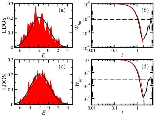 Above, is the energy distribution of the initial state weighted by the components . It is often referred to as the local density of states (LDOS) or strength function. For full random matrices, this distribution is a semicircle [17,18], as the density of states in Equation (2). This is seen in Figure 2a. The Fourier transform of a semicircle gives: