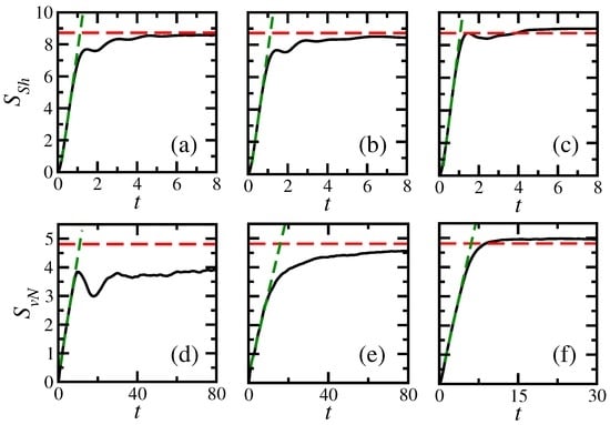 The entropies in Figure 2c,d initially grow nearly quadratically, as can be verified by expanding Equation (19). This gives: