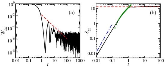 which matches the numerical results well for very short times. Subsequently, the data are very well fitted with a linear curve, as shown with circles in Figure 2c,d. This makes a connection with the linear behavior, , studied theoretically in realistic systems [4,43,44,45,46,47] and also observed experimentally [30].