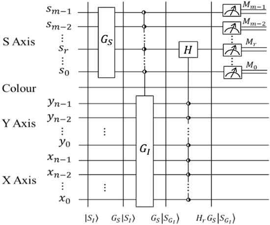 The circuit shows that GS operations on the m strip wires; m (0 or 1 controlled operations that are depicted using the half-moon notation that is further explained in Section 3); GI operations that lead to geometric exchanges between 2m images encoded in the strip; and zero (0) or one (1) 2n–control condition Hadamard operations followed by m measurement operations are needed in order to compare the similarity between multiple quantum images. It should be noted that the measurements M0 to Mm–1 that are depicted in Figure 2 are standard measurement operations that lead to the collapse of the quantum state, and as such the images encoded on the strip are lost after each measurement cycle is executed [14].