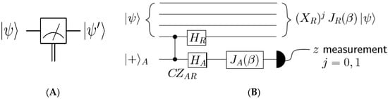The description of Figure 3B as provided via [24] presents the ancilla-driven implementation of a single qubit rotation, JR(β), on a register qubit R, where the initial state of the total register can be a pure state, , or accordingly for a mixed state. The ancilla and register qubits are first coupled with EAR = HA·HR·CZAR. The rotation J(β) is then implemented on the fully controlled ancilla and transferred to the register qubit by measuring the ancilla in the z-basis. The result of the measurement, j = 0, 1, determines if an X correction appears on the register qubit.