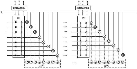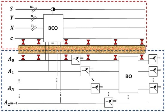 As seen in this figure, the proposed QIFM consists of two blocks: the upper block (shown inside the red short-dashed rectangular box) is the strip encoding our register of 2m FRQI quantum images; and the lower block (shown inside the blue short-dashed rectangular box), which presents the ancillary information that is crucial for the preservation of the coherence needed for quantum computation. The brown layer (with icons that resemble an hour-glass) that separates the two blocks depicts the interaction that is envisaged between the quantum register and the ancillary information, which is mostly retrieved from the classical versions of the images. Descriptions of how this interaction is facilitated were highlighted in Section 2, but detailed discussions can be found in [14,24] and the other literature therein. We should further add that this interaction provides the required coupling needed for the ancilla-driven (non-destructive) measurement operations as highlighted in Figure 3B and explained in detail in [24].