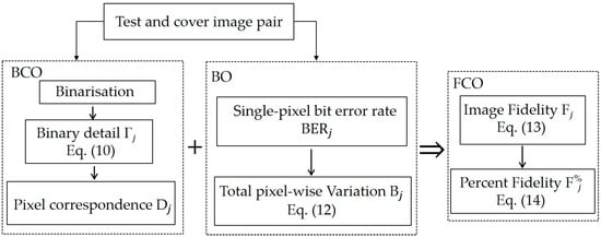Meanwhile, the flowchart depicting the algorithmic structure of our proposed QIFM metric is presented in Figure 5 and a detailed explanation of its two main units, i.e., the binary check operation (BCO) and bit error rate operation (BO), is presented in the remaining subsections of this section. Its implementation, in latter parts of this study, will, however, be limited to estimating congruity between only two images—a reference image and a test image—as a pair.