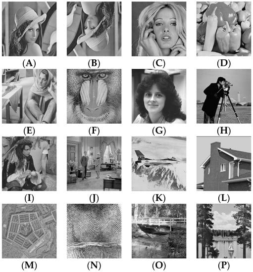 Dataset of images paired for the FPS analysis. (A) Lena; (B) Inverted Lena; (C) Blonde Lady; (D) Peppers; (E) Scarfed Lady; (F) Baboon; (G) Brunette Lady; (H) Cameraman; (I) Man; (J) Couple; (K) Aeroplane; (L) House; (M) Pentagon; (N) Fingerprint; (O) Bridge; (P) Trees.