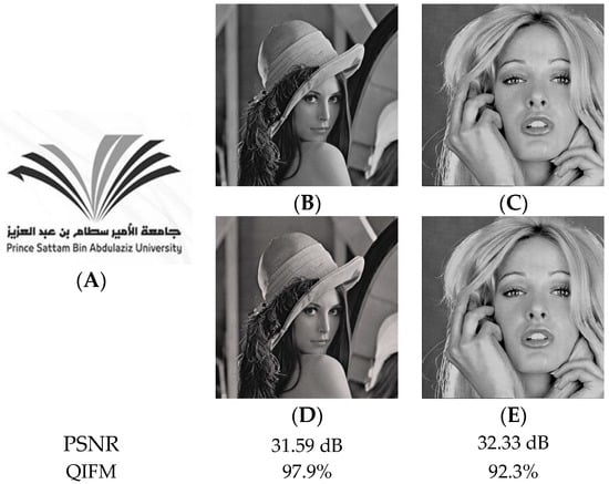 Comparison between PSNR and QIFM for watermarked images. (A) PSAU watermark logo; (B) original Lena image; (C) original Blonde Lady image; (D) watermarked version of Lena image; (E) watermarked version of Blonde Lady image.